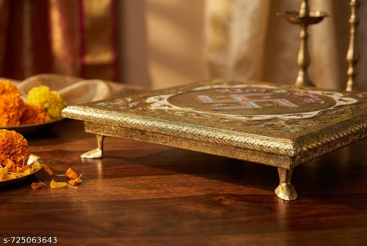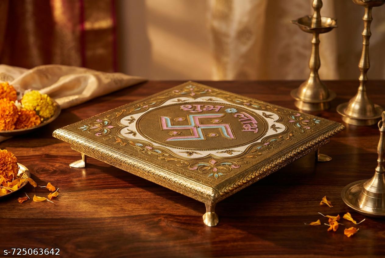 Material: WOOD Type: Puja Chowki Product Length: 25.5 cm Product Height: 25.5 cm Product Breadth: 1.5 cm Net Quantity (N): 1 Material: It is primarily made of wood, potentially coated with a golden brass or metal sheet. Design: The chowki features intricate, vibrant traditional designs and patterns, characteristic of Meenakari or Rajwadi work. The top surface prominently displays the Hindu symbols “Shubh” (auspicious) and “Labh” (gain/profit), along with a Swastik symbol, written in Hindi script. Usage: This traditional piece is used as a platform for placing deity idols, offering plates, or other religious items during daily prayers, festivals, and ceremonies. The elevated design with small, sturdy feet helps maintain the sanctity of worship items. Dimensions: The product measures approximately 10 by 10 inches (LxW). Features: It is a handcrafted, durable item that can be easily cleaned and is often used as a decorative showpiece or given as a gift. Country of Origin: India