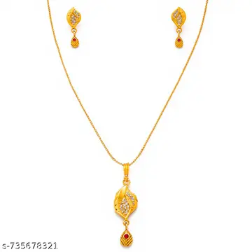 Base Metal: Brass Plating: Brass Plated Stone Type: No Stone Sizing: Non-Adjustable Net Quantity (N): 1 Sizes:Free Size Product Features: Premium Gold-Tone Plating: The jewellery is plated using a high-quality process on a durable brass/alloy base, which ensures a lasting shine and authentic gold appearance. Intricate Pendant Design: The centerpiece features a delicate, artistic leaf-shaped pendant adorned with shimmering cubic zirconia (AD) stones, adding a touch of brilliance and grace. Traditional Black Beads: The sleek golden chain is interspersed with traditional black beads, an auspicious symbol widely recognized across India as the mangalsutra, thaali, or nallapusalu. Matching Stud Earrings: This set includes a matching pair of elegant leaf-design stud earrings, completing your traditional look effortlessly. Lightweight & Comfortable: Designed for daily office wear or special occasions, this set is lightweight and skin-friendly (nickel and lead free), ensuring comfort throughout the day.(not for original gold ) Country of Origin: India