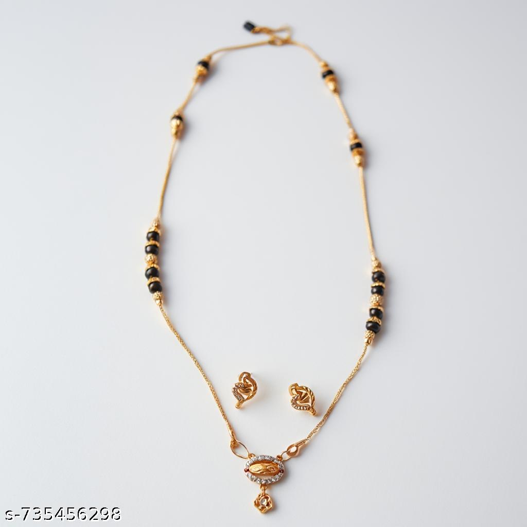 Base Metal: Brass Plating: Brass Plated Stone Type: No Stone Sizing: Non-Adjustable Net Quantity (N): 1 Sizes:Free Size Product Features: Premium Gold-Tone Plating: The jewellery is plated using a high-quality process on a durable brass/alloy base, which ensures a lasting shine and authentic gold appearance. Intricate Pendant Design: The centerpiece features a delicate, artistic leaf-shaped pendant adorned with shimmering cubic zirconia (AD) stones, adding a touch of brilliance and grace. Traditional Black Beads: The sleek golden chain is interspersed with traditional black beads, an auspicious symbol widely recognized across India as the mangalsutra, thaali, or nallapusalu. Matching Stud Earrings: This set includes a matching pair of elegant leaf-design stud earrings, completing your traditional look effortlessly. Lightweight & Comfortable: Designed for daily office wear or special occasions, this set is lightweight and skin-friendly (nickel and lead free), ensuring comfort throughout the day.(this is not origenal gold) Country of Origin: India