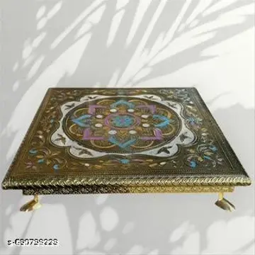 Material: WOOD Type: Puja Chowki Product Length: 1 Inch Product Height: 12 Inch Product Breadth: 1 Inch Net Quantity (N): 1 Materials: High-quality seasoned wood finished with rust-resistant metal foil. Design: Intricate Meenakari (enamel) detailing that catches the light and adds a pop of color. Versatile Decor: While ideal for the Pooja room, its “Eye-Catching Beauty” makes it a perfect accent piece for living room decor or as a pedestal for luxury candles. Durability: Built to last through generations of daily rituals and festive gatherings. Country of Origin: India